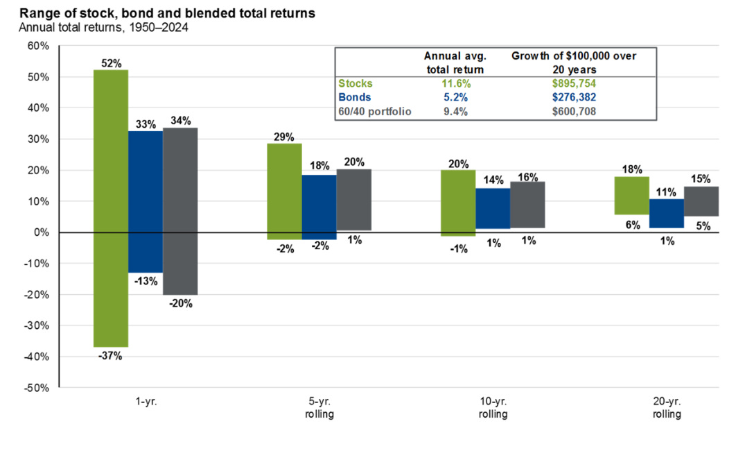 JP Morgan’s Guide to the Markets shows that a 60/40 portfolio has historically delivered slightly lower returns to an all-stock portfolio but with much less volatility, making it a cornerstone strategy for many institutions and individuals.