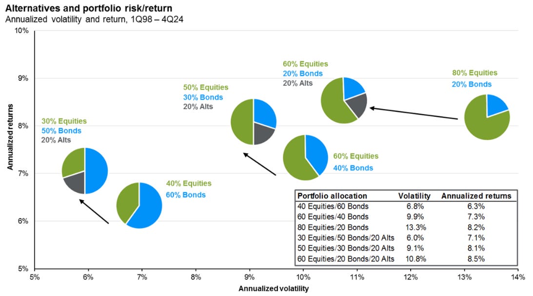 Historically, adding certain alternatives to a portfolio has provided slightly higher returns with lower volatility than a typical 60/40 portfolio (see chart below):