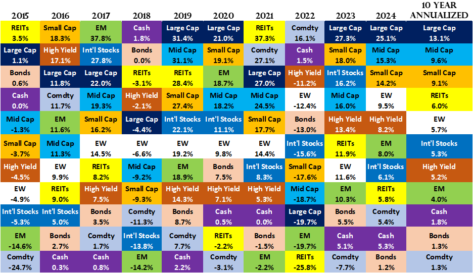 Below are the returns of different investments over the last decade (2015-2024) and their annualized returns (see column furthest to the right):