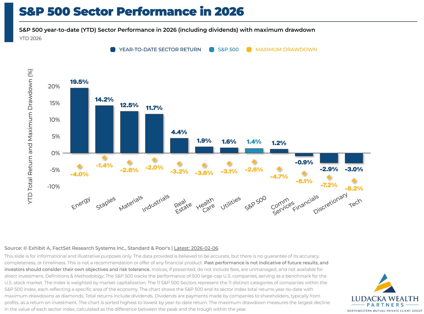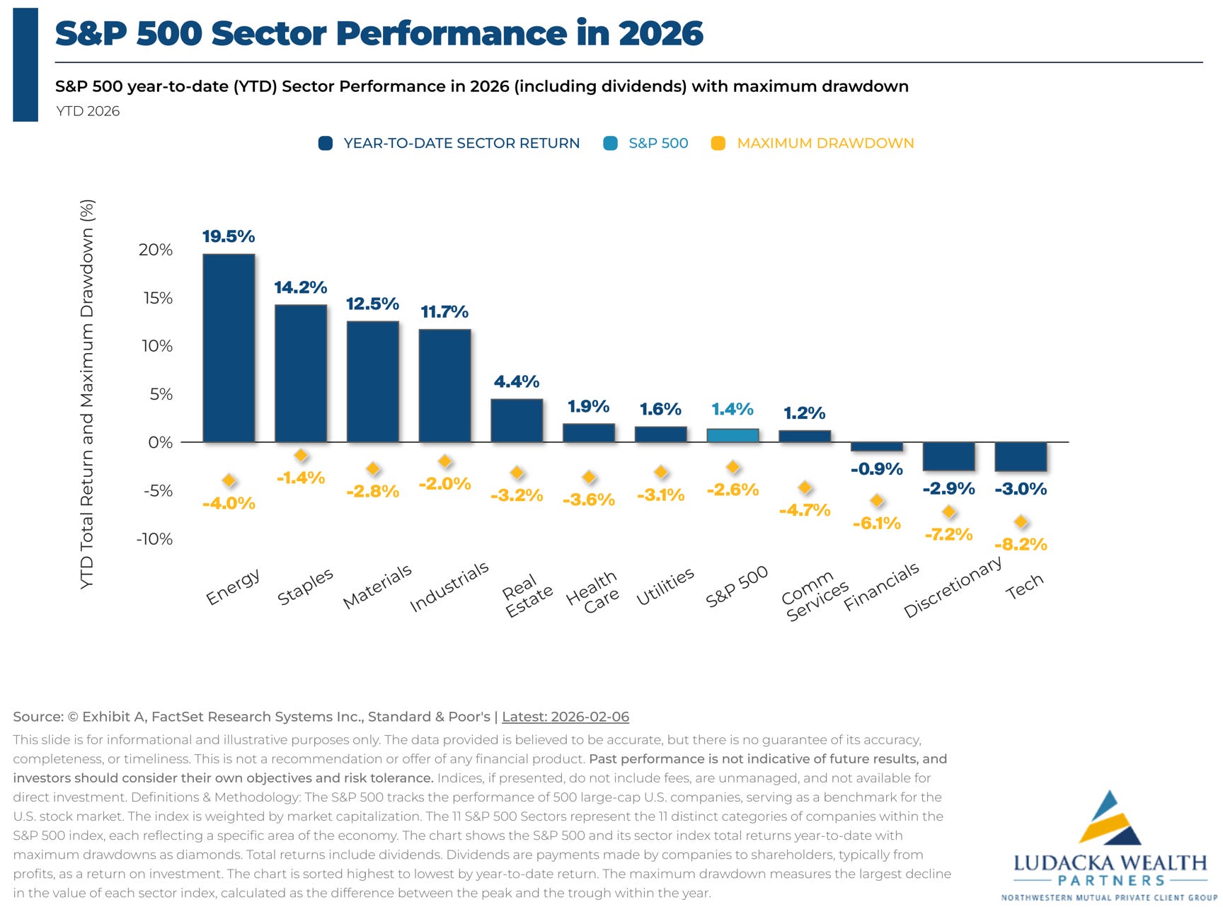 Energy and Consumer Staples (two of the best-performing sectors year-to-date) make up about 16% of the S&P 500 Value Index. In the S&P 500 Growth Index, those same sectors represent just 1%.