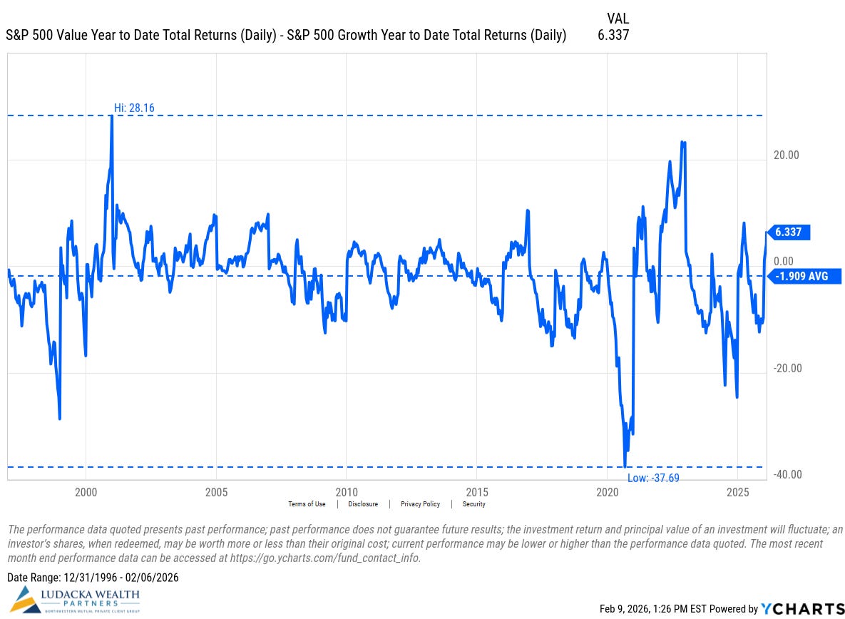 So far this year, the S&P 500 Value Index has outperformed the S&P 500 Growth Index by about 6%, well above its long-term average (see chart below):